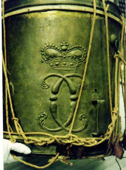 Photos of original Brunswick Drums. Most of the Drums used in the Brunswick Army were brass drums. Only a few wooden shell drums were shipped to North America. We can not say what drums were used with the diferent Brunswick units. Please note that the last two photos show a drum which also had hoops made from brass. This was very rare. Most drums used a brass shell and woooden hoops like the top photo. The painted design of the hoops was probably different with every unit.
