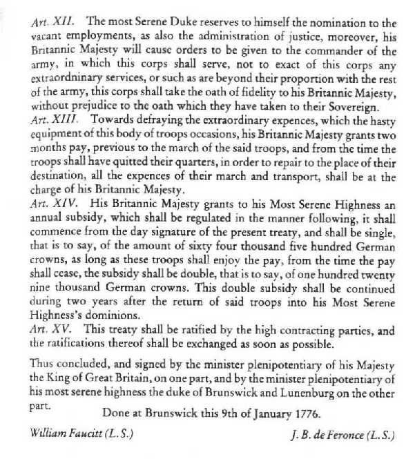 The English Crown signed a defense treaty with Hessen and Brunswick. It stated that if these states were attacked, the British would intervene and help in their defense. This was designed to prevent the French from attacking these states, again. The two states of Hessen and Brunswick were to supply the British with a corps each, to fight the rebels in North America. Britain was to pay for these troops. The equipment for these troops had to be bought in Hessen and Brunswick. It was to help the industries of both states. The money from these treaties helped the Brunswick tax-payer's till 1918.