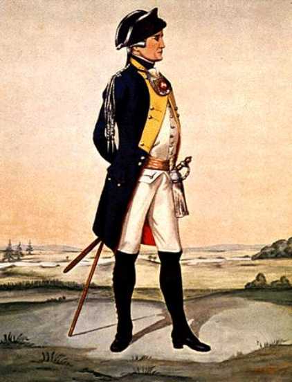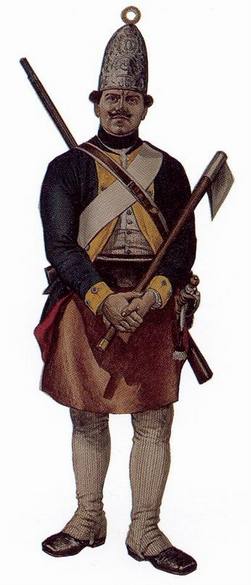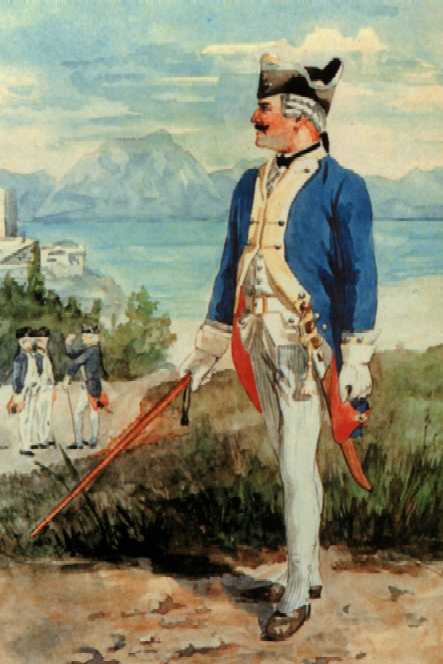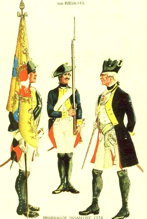 Shown here are the uniforms of the Regiment Riedesel. The unit was formerly the second Batl. "Prinz Friedrich". The NCO is clearly recognized by carrying a stick. The stick was more a status symbol of the NCO's than anything else. The top illustration also shows the grenadier of the regimentt. In wartime the grenadier company would be taken out and would form with the other grenadier companies the Grenadier Batl. "Breymann". The drummers coat is always in yellow. The color of the House of Brunswick. Officers had the coat-backs folded down. On duty the officer wore the gorget or Ringkragen. The gorget was a left-over from the time suits of armour were worn. Zimmermann were mostly used as helper in manning the regimental artillery pieces. Normally a Regt had two three or six-pounder cannons attached to them.