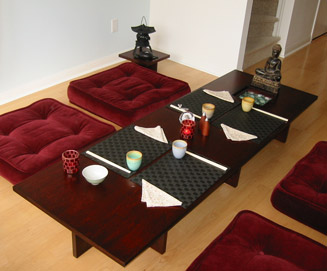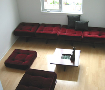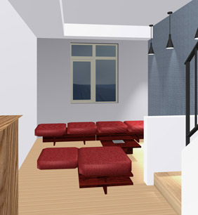 Raynes took better advantage of the light pouring in through a plexiglass door leading to the deck from the second-storey bedroom staircase. On both levels, the staircase had been completely enclosed, so he removed its outside wall on the second storey and drew daylight deeper into the bedroom. And to pull a little of that same light farther down to the main level, he partly opened up the stairwell there by chopping off the top of the outside wall. He says he also opened a four-inch gap between the stairs and the inside wall to create a sense that "something's going on upstairs with light." Storage space was a particular concern because, despite the apartment's high, nine-foot ceilings, he didn't want to make it narrower by putting in dressers, tables and other large pieces of furniture. "For the bedroom I started with the idea of a captain's bed with pull-out storage underneath," says Raynes. But he ended up building a storage platform 12 feet by 9 1/2 feet, just about the length and width of the bedroom. The platform is now two steps higher than the hallway floor leading to it. It is made of nine boxes, three feet wide by four feet long by 16 inches deep. Raynes built them off premises with three-quarter inch plywood, added lids finished in maple veneer to match the hallway, and then screwed the boxes to each other in the room. The boxes have all been subdivided into three smaller compartments each, except for the two under the bed used for storing larger items. The 23 compartments hold everything from socks to hanging folders. One even serves as their laundry hamper. But Raynes says the platform also serves an important aesthetic purpose: because the bedroom area is now 16 inches shorter than the hallway, it changes the proportion of the end wall and makes the room look wider. The main floor presented a similar challenge. Raynes used his computer to design the type of furniture he thought would work, then placed it in the 3-D apartment to test his ideas. "The living/dining room is way too small for conventional furniture. Instead, we bought a bunch of Japanese-style floor cushions, each about the size of a sofa cushion, but firmer. Then we built some low table/benches — two square and two rectangular ones. The cushions can go on top of the tables or on the floor alongside them." The tables are made of one-inch Baltic Birch plywood, stained cherry red. The four pieces can be arranged in many configurations: usually the benches are lined up under the window, with the square ones serving as coffee tables. But they can all be assembled to make one dining table, using the cushions as chairs, or rearranged to fit an inflatable queen-size mattress for overnight guests. The furniture and the platform storage materials cost about $1,100. Raynes estimates the price might have jumped to $5,000 if he'd hired someone to do the work, but believes even that cost would have been well worth it because it makes their apartment so much more liveable. Because the space is small, Raynes says he's taken pains to keep the look "minimalist." There are no dangling cords anywhere. In the bedroom, electrical wires are hidden under the platform. The television sits on a bracket screwed into one of the bedroom walls, its electrical cord threaded through the unit's only closet behind it along the hallway. In that hallway between the mirrored closet and the bathroom is a nook where Raynes created a computer station. To keep the look clean, he built a computer table supported from the wall to keep the space open underneath it and threaded all the wires into the closet beside it. He built a sliding tray for the computer keyboard and another tray under that to hold a second sliding tray for an electronic piano keyboard. "By the time I moved into the loft last year, I had studied the model so much I felt I was living in a holodeck program (a computer program in the television series Star Trek that allows characters to create and inhabit virtual worlds). But the woman across the hall, with an identical suite, burst into tears when she did her walk-through inspection because she had thought it would be so much bigger," he recalls.