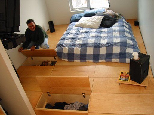 OPEN THE HATCH: Peter Raynes built a platform in his bedroom to create storage space in his 550-square-foot penthouse loft on Front St. W. The platform is two steps higher than the hallway floor leading to it and has nine lidded boxes. | ||