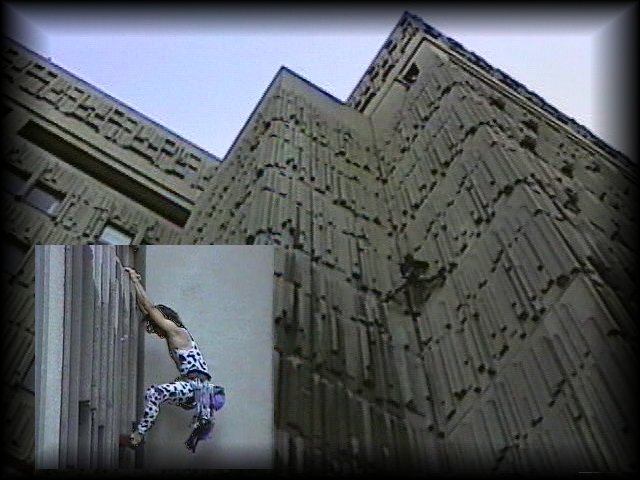 Rock, plastic, steel. Nature, culture, the imaginary. These are but some of the media and environments being explored by ‘HIgH Xposure’. HIgH Xposure is a radgroup of Toronto area climbers pushing different kinds of limits in vertical movement By combining the basic action elements of rock climbing and converting walls and spaces into a perpendicular stage they have created ‘rock climbing dance theatre’. In the tradition of Bandaloop but with a good measure of Cirque du Soleil thrown in this group explores the cross over of art and athletics in three dimensions. From transforming a local Toronto area indoor climbing gym into a theatre-not-in-the-round but into a theatre-in-the-vertical, to using the undergrid of a large concrete and steel bridge for a kind of ‘gorilla’ street theatre, to transforming a 100 year old Southern Ontario barn into a spectacle of the senses... HIgH Xposure is art in exhiliration. HIgH Xposure - putting exhiliration back into art. 1st Toronto Bridge Day - September 1995 (Yonge&StClair) CAMPUSPANICJuly1997 In Tensions TENSEGRITY ON SPADINA - March 1998 LIVESTOCK - Music Dance Festival, 1996 HIgH Xposure and the Total Eclipse of the Sun MAY 1994 HIgH Xposure is about rock climbing dance theatre. It is also a ritual. For millenia, man observed the movements of the celestial spheres. The great astronomical events, the equinox, solar and lunar eclipses, inspired both celebration and terror. These events became signs, bits of news from the realm of the truly Other. The Solar eclipse is a phenomenal expression of a three body problem. Earth, moon, and sun are three bodies continually falling towards each other.The trajectories of these celestial motions form complex elliptical orbits. We are falling towards the sun and the moon is falling towards the earth. At high tide even the earth’s oceans begin to fall towards the moon. Gravity is the ‘force/field’ that human bodies experience falling towards the earth. Gravity, a universal constant, also creates the conditions of the earth’s falling towards the sun. Falling a distance of one inch on earth partakes of the same gravitational mystery as the moon in its falling towards the earth. HIgH Xposure then, is about two bodies falling together, one very much smaller than the other, and only one a conscious body. HIgH Xposure is a ritual celebration of the great and small events of gravity. Its co-incidence with the rare full eclipse of the sun in Toronto inMay1994 compells us to simply stand back and say -YES.
